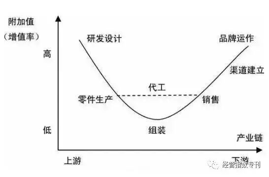 我们知道在制造业领域有一个著名的理论叫“微笑曲线”,曲线的左边是研发,曲线的右边是渠道,中间最低点就是制造业,它代表的是低附加值、弱抗风险能力以及高劳动密集环节。